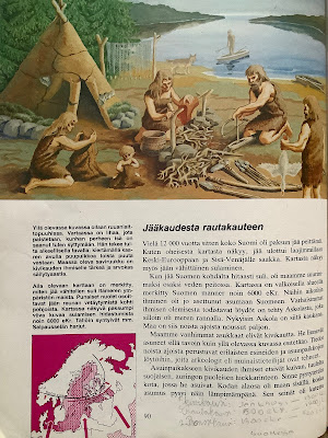 Viimeisenä koulukirjana esittelen oman 5-luokan hissankirjani. Jotenkin nyt aikuisen silmin ihmettelen sitä asioiden painotusta tuossa kirjassa. Todella vähän Suomen alueen kivikautta taikka rautakautta ja lähes loput kirjasta sitten jorisee jotain ihmeen Kreikkalaisten ja Roomalaisten pyörimistä milloin missäkin. Siis oikeesti! Kymmeniä sivuja sellasta, joka ei kiinnosta ketään 11-vuotiasta! Oon myös sitä mieltä, että ihan liikaa ennen painotettiin vuosilukuja, kun oikeesti tärkeää on vain tajuta mikä oli ensin ja mitä tuli sen jälkeen, mikä johti mihinkin ja oliko kivikausi 1700-luvulla vai eikö ollut. Mutta katsokaapas, on siellä sentään sivuja Saamelaisista melkein yhtä paljon kuin rautakaudestakin, että ihan turha väittää, että heistä ei ikinä kerrota missään. Kerrottu on. Tosin ainakaan mulle siitä ei jääny mitään mieleen.